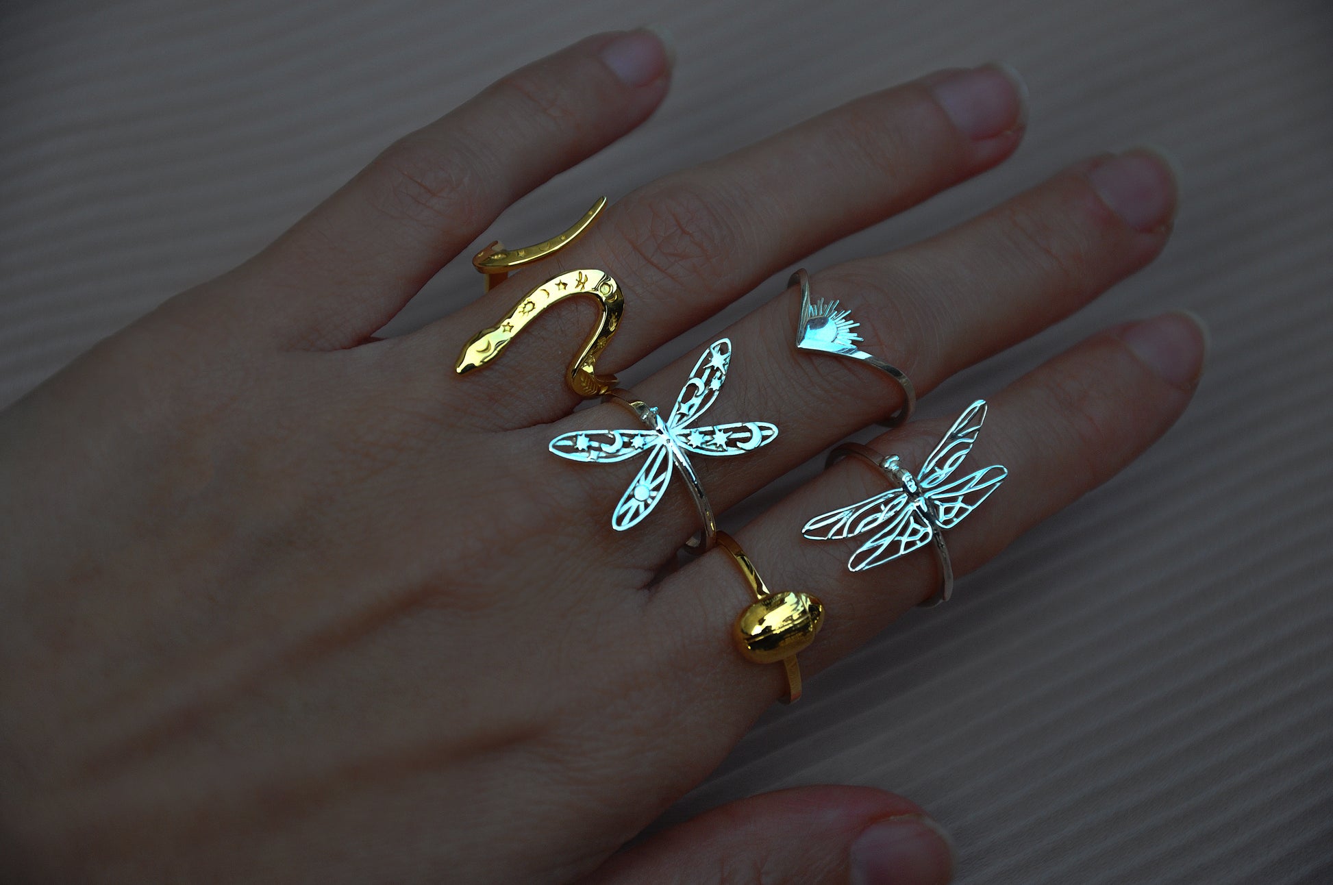 Description: This unique ring showcases a meticulously crafted damselfly with an enchanting cut-out design in its wings. Inspired by celestial elements—the stars, moon, and sun—this one of a kind piece captures the imagination.