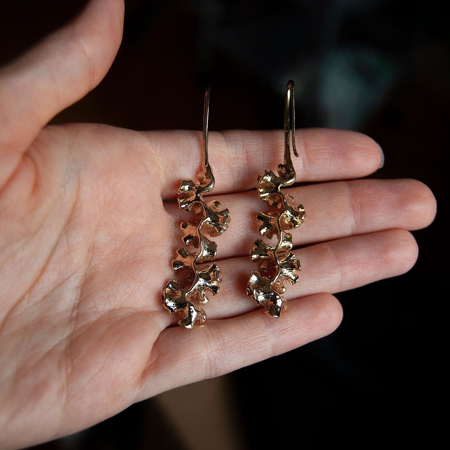Celosia Cristata flower-inspired drop earrings. These earrings are crafted using handmade drawings and digital sculpting, which are used as prototypes in the studio in Milan. The final creations are 3D printed in a process that combines the technology of 3D printing with the traditional wax casting technique, developed by humans thousands of years ago. The brass earrings are carefully cleaned and hand-polished to achieve a smooth and shiny finish.