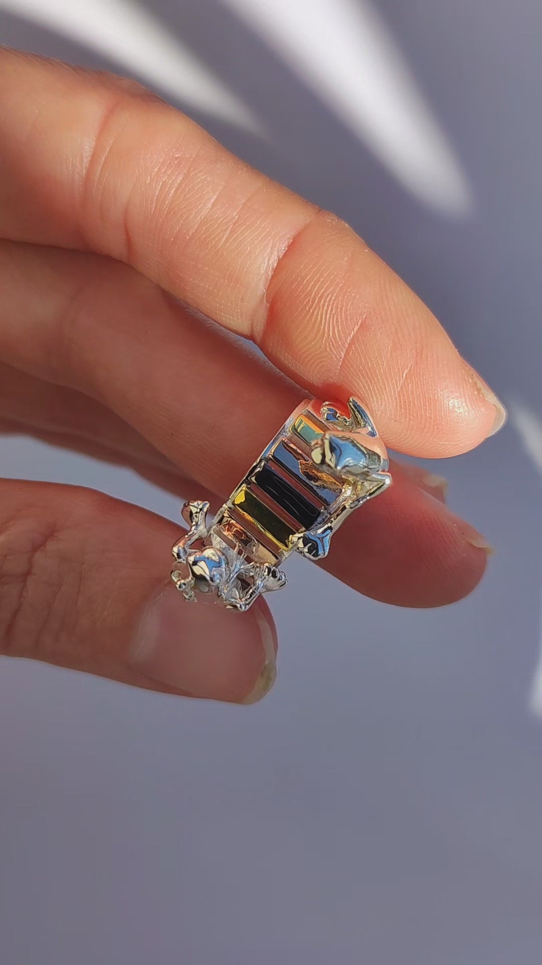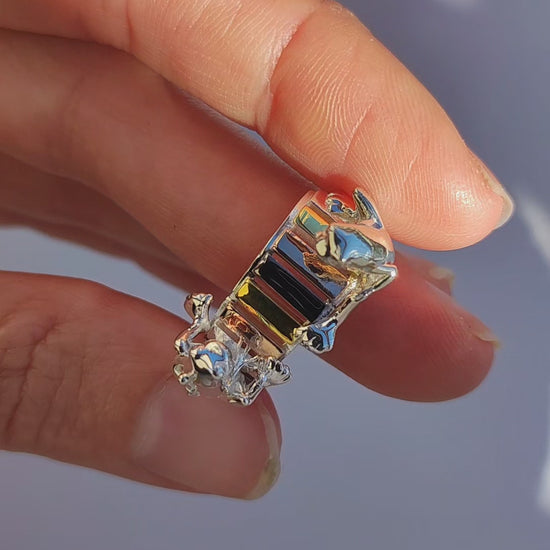 A miniature burst of color and charm, the Frogs on the Rainbow Keys Ring captures two tiny frogs perched at opposite corners of a vibrant xylophone. One frog holds his mallet tucked playfully behind his back, while the other leans forward with his mallet raised — as if caught mid‑performance in a joyful duet. Designed as a wearable sculpture, this whimsical statement ring blends imaginative storytelling with fine craftsmanship, creating a tiny rainbow concert hidden in plain sight.