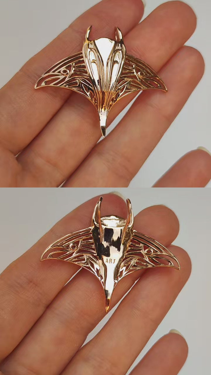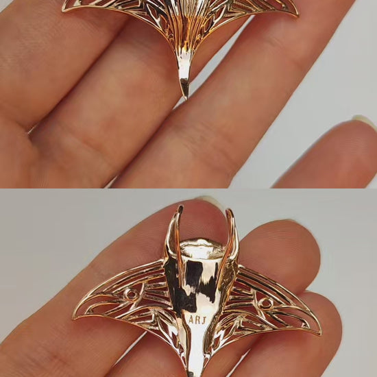 The pendant has cut-outs in the wings, creating a fantasy effect and making it intricate and lightweight. The cut-outs also allow light to shine through, enhancing the beauty of the manta ray. This pendant is made of precious metals, such as sterling silver, 14k gold plated or bronze, that reflect the quality and craftsmanship of the design. This pendant is a perfect gift for anyone who loves manta rays, marine life, or nature. It is a symbol of intelligence, grace, and harmony.