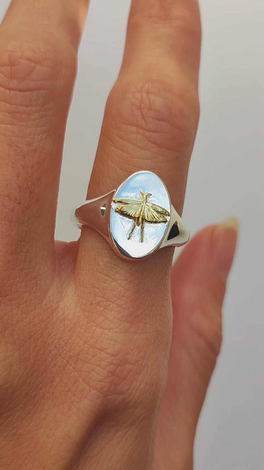 Dreamlike and intuitive, this 925 sterling silver signet ring captures the Grasshopper, embossed in 14k gold plating. Known for its leaps guided by instinct, the grasshopper symbolizes creativity, rhythm, and spiritual flow. This mirrors Pisces’ sensitivity and imaginative nature. A talisman of intuition and adaptability, it celebrates Pisces’ connection to movement and dreamlike vision.