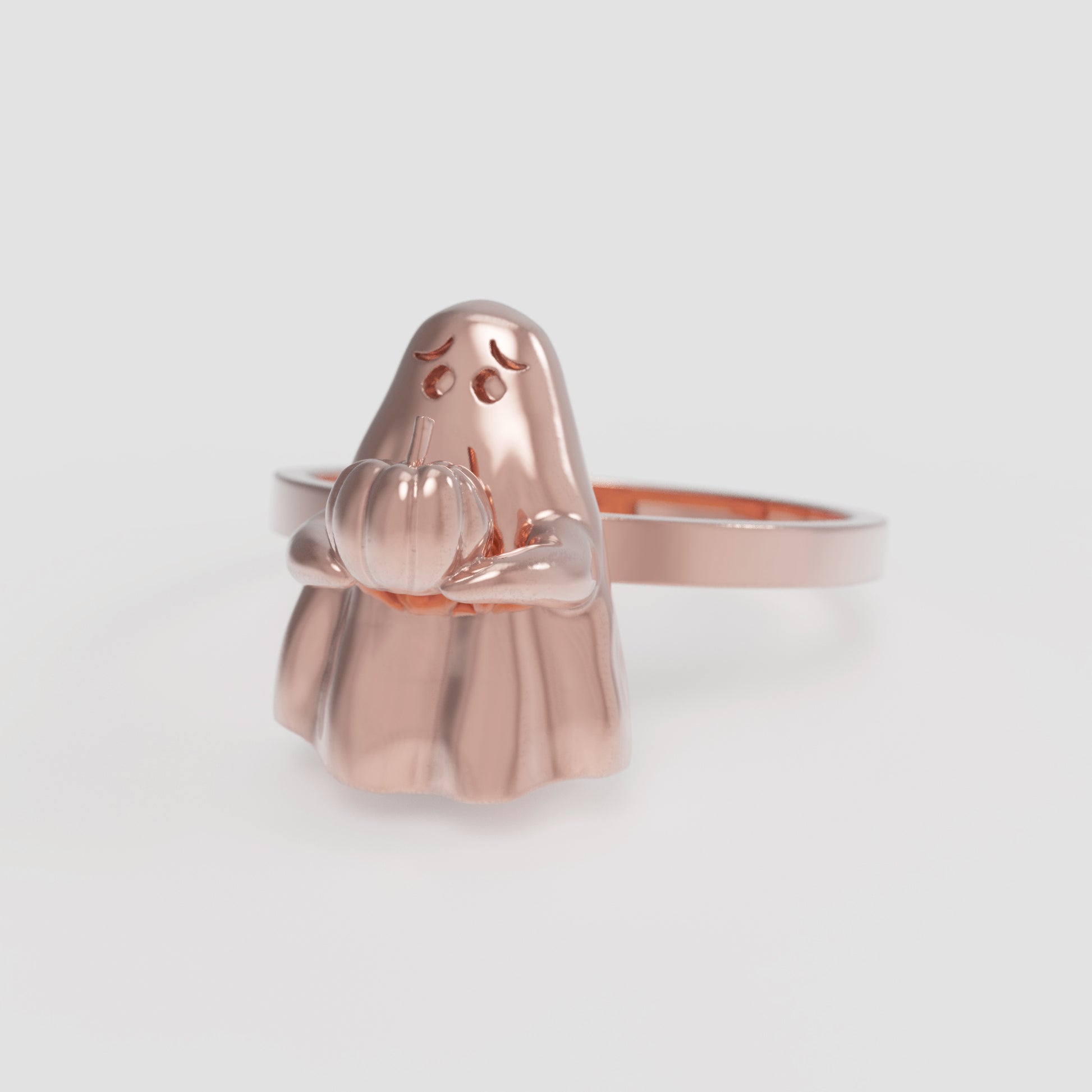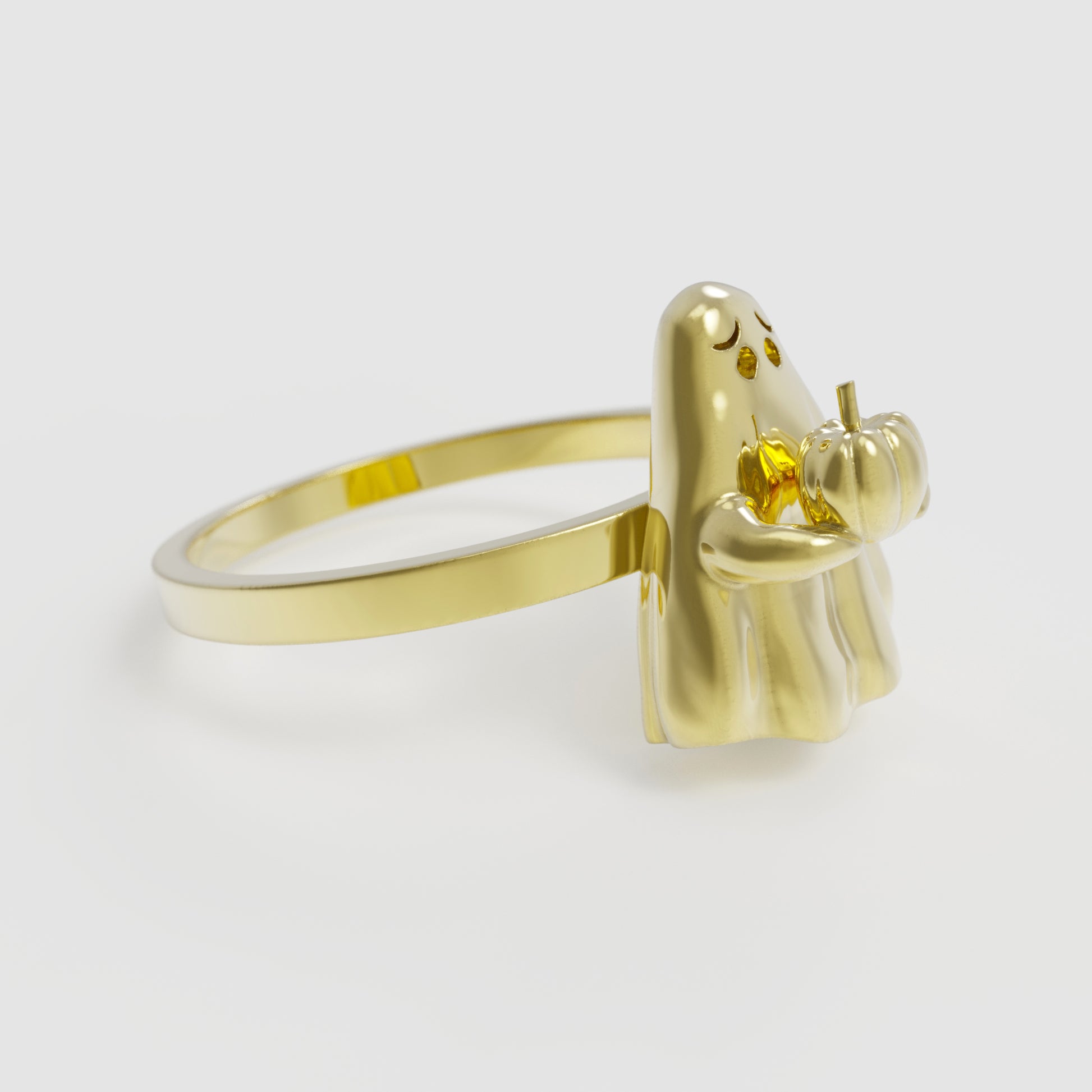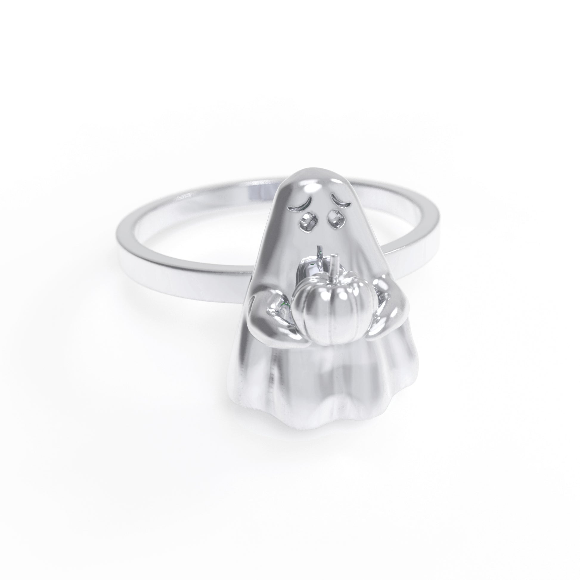 The sad ghost cradles a tiny pumpkin in its spectral hand. A symbol of nostalgia, this ring evokes both melancholy and warmth.