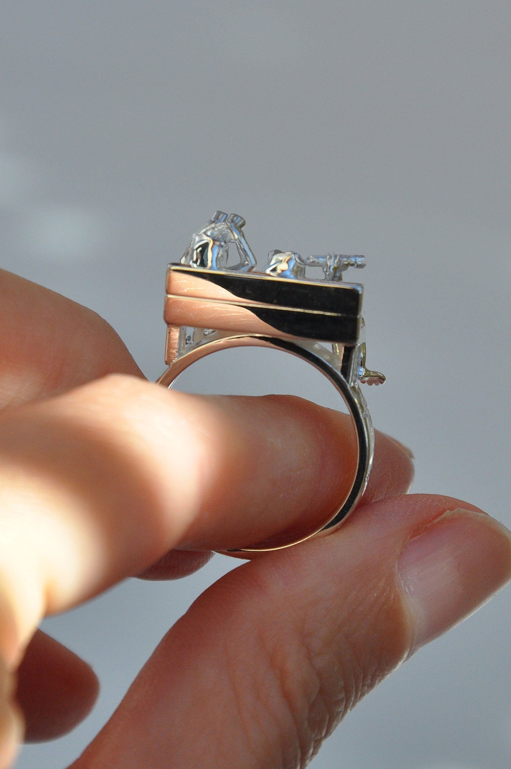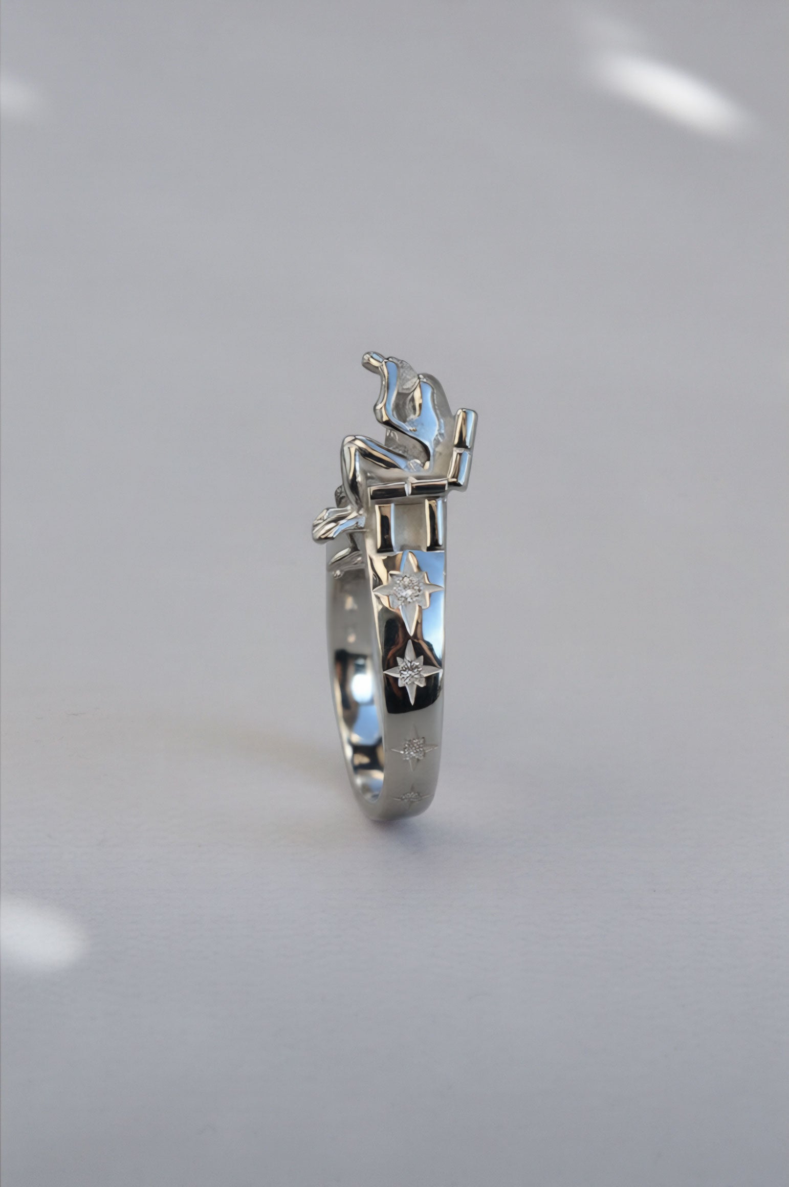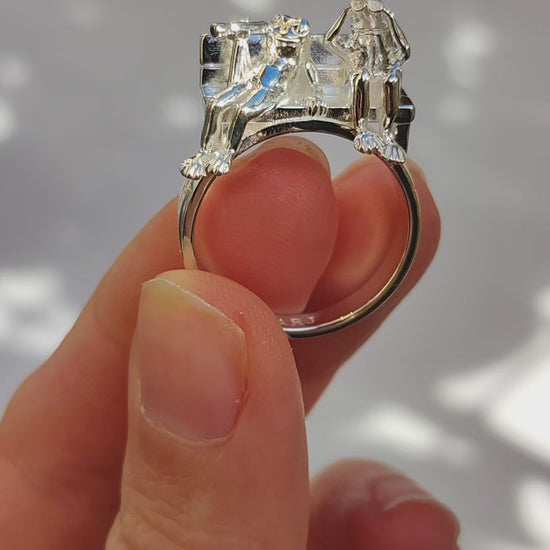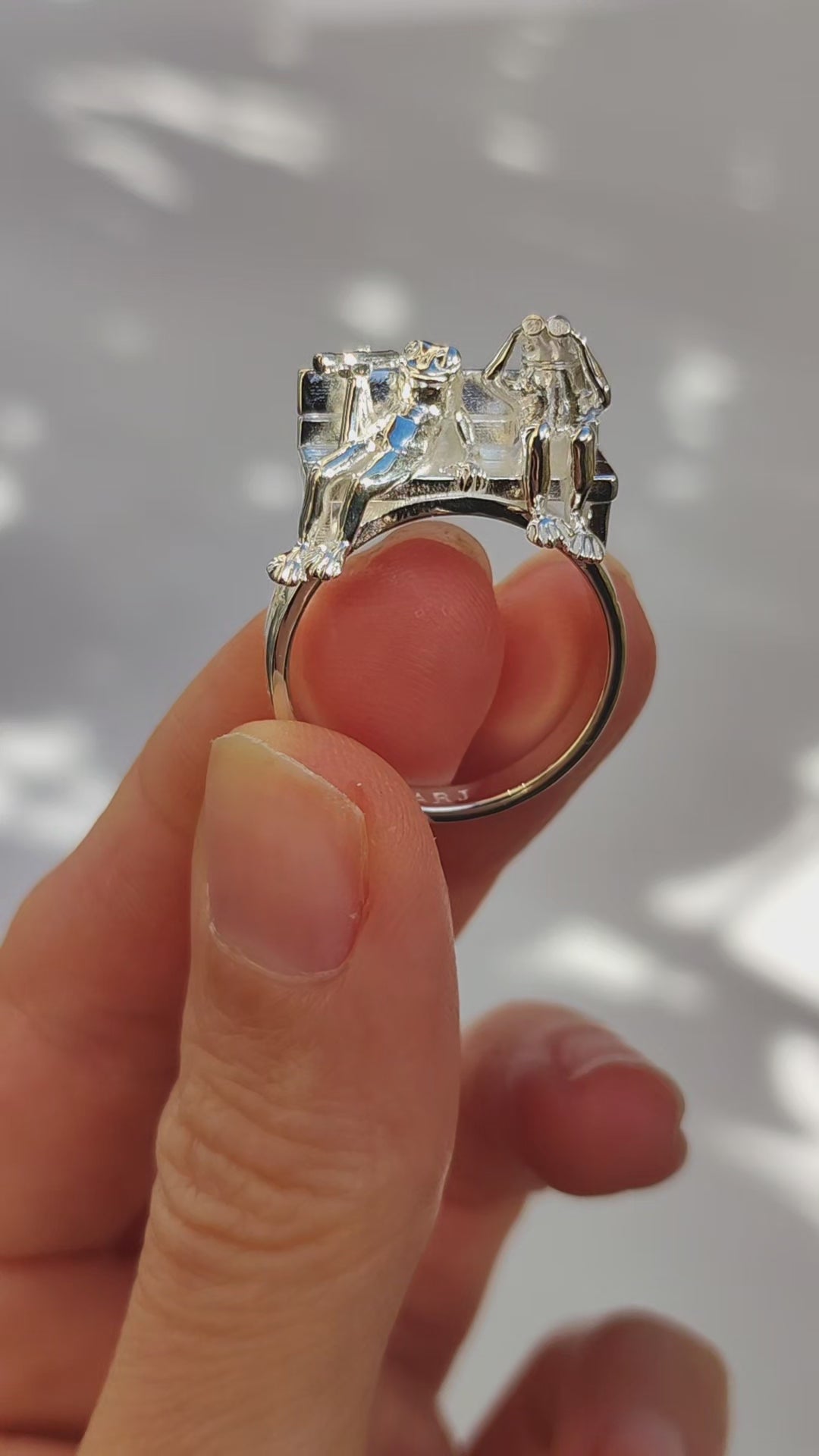 A miniature scene of quiet wonder, the Stargazer Frogs Ring captures two tiny frogs in a moment of shared curiosity. One sits upright with a pair of delicate binoculars; the other reclines with a single‑lens viewer — both gazing at crystal stars arranged above them like a night sky unfolding in miniature. Designed as a wearable sculpture, this unique, collectible statement piece blends natural storytelling with fine craftsmanship, creating a pendant that feels both playful and poetic.