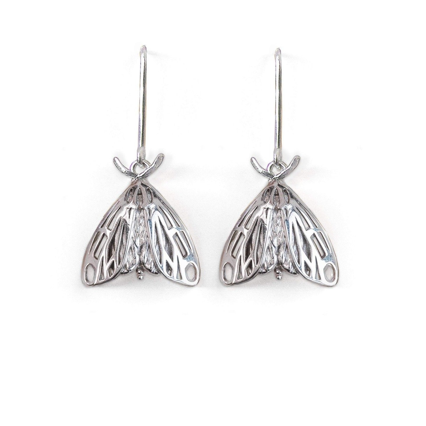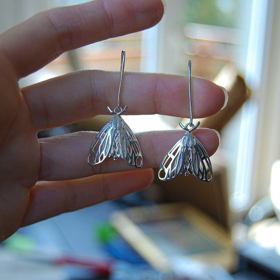 These earrings feature forest-dwelling, night-flying tiger moths with folded wings. Tiger moths are brightly colored, with bold markings in geometric shapes. They tend to be small to medium in size and bear filiform antennae. The adults are mostly nocturnal, and hold their wings flat, like a roof over their bodies, when at rest. These earrings are designed using digital processes and handmade techniques. The jewelry piece is designed by me entirely from hand drawings, and is 3D printed in high quality sterling silver using the lost wax casting technique. The earrings are then carefully cleaned and hand polished to achieve a smooth and shiny finish.