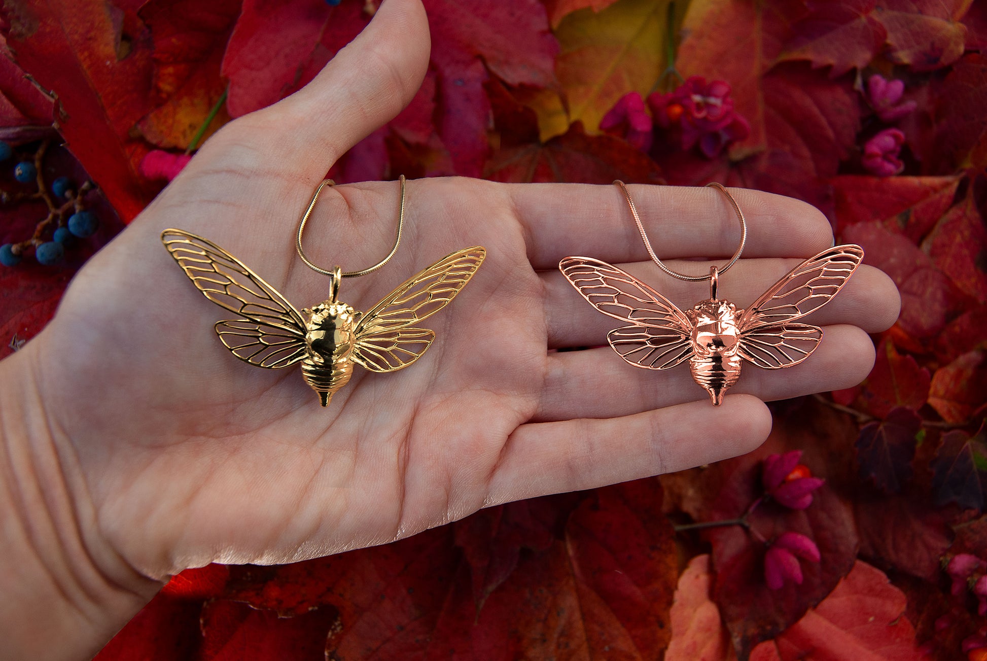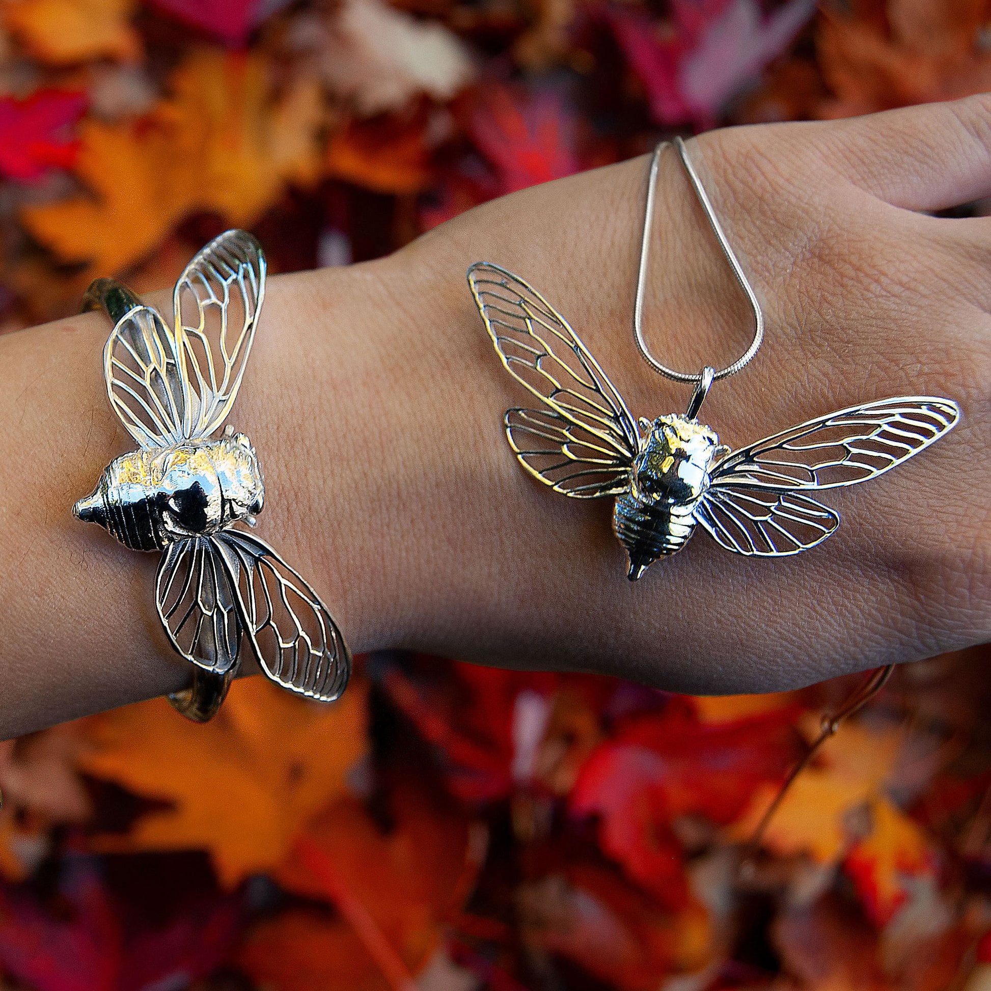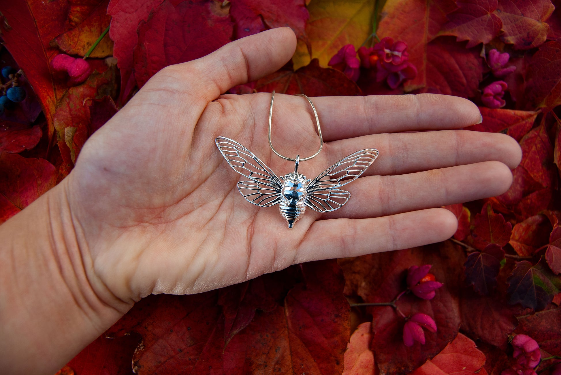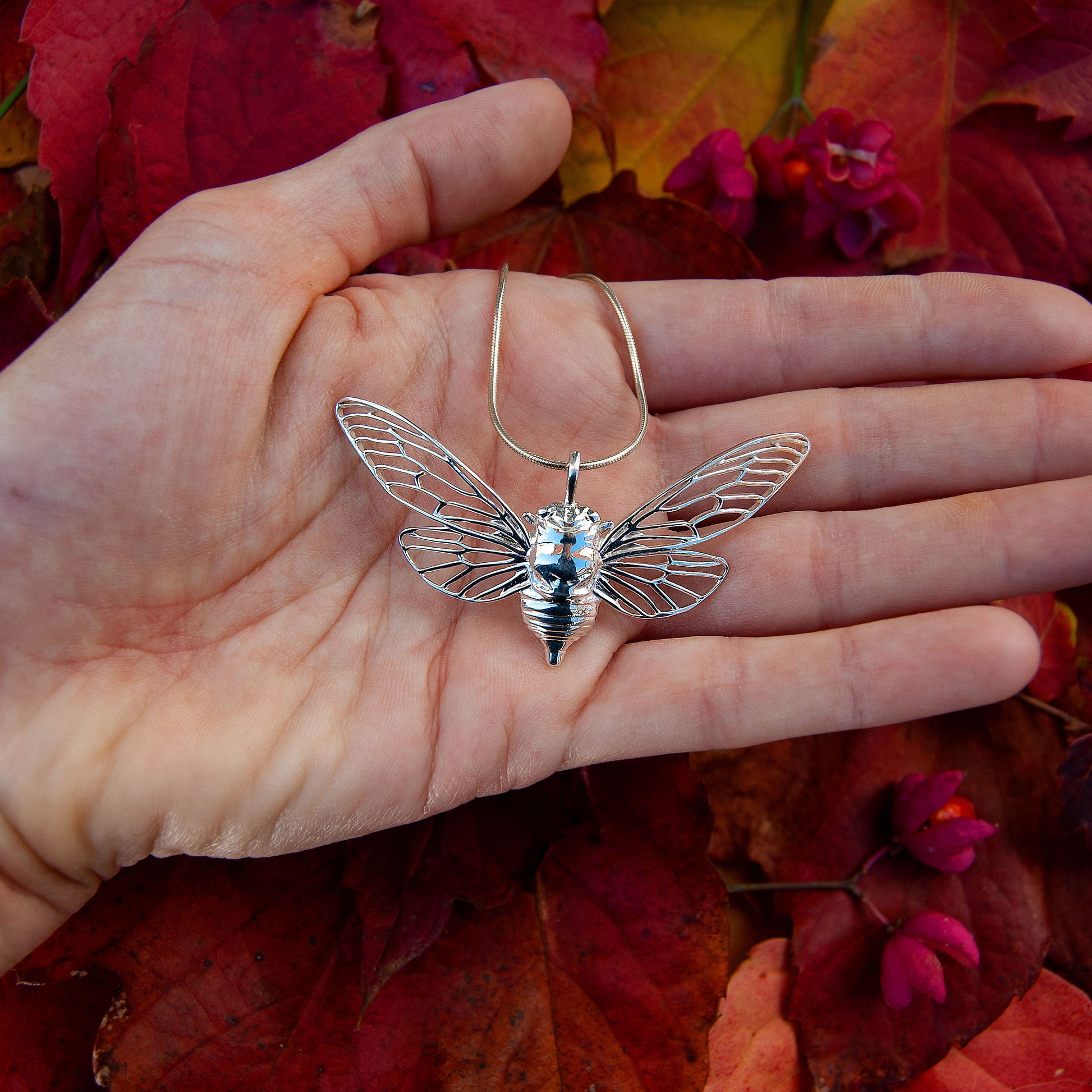 This piece is designed using digital processes and handmade techniques. The pendant is designed by me entirely from hand drawings, and is 3D printed in high quality sterling silver using the lost wax casting technique. The cicala pendant is then carefully cleaned and hand polished to achieve a smooth and shiny finish.