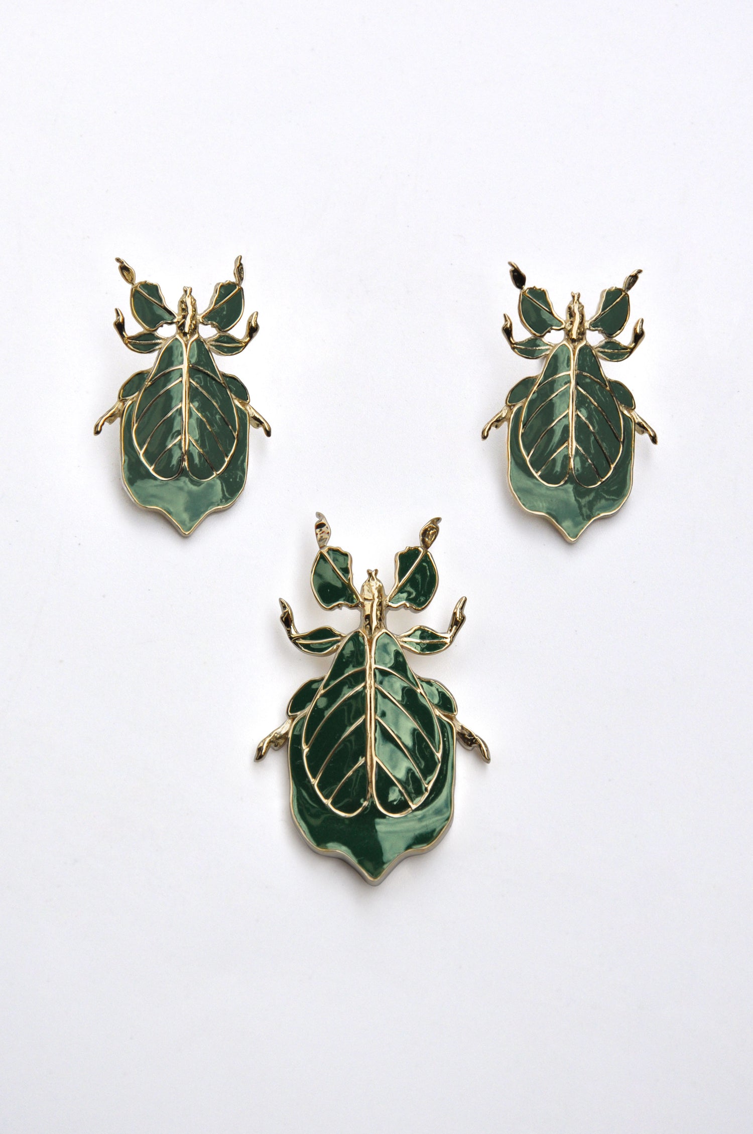 A deep, luminous green inspired by living foliage. Pendant and earrings finished with hand‑applied enamel, capturing the walking‑leaf’s quiet, otherworldly disguise.