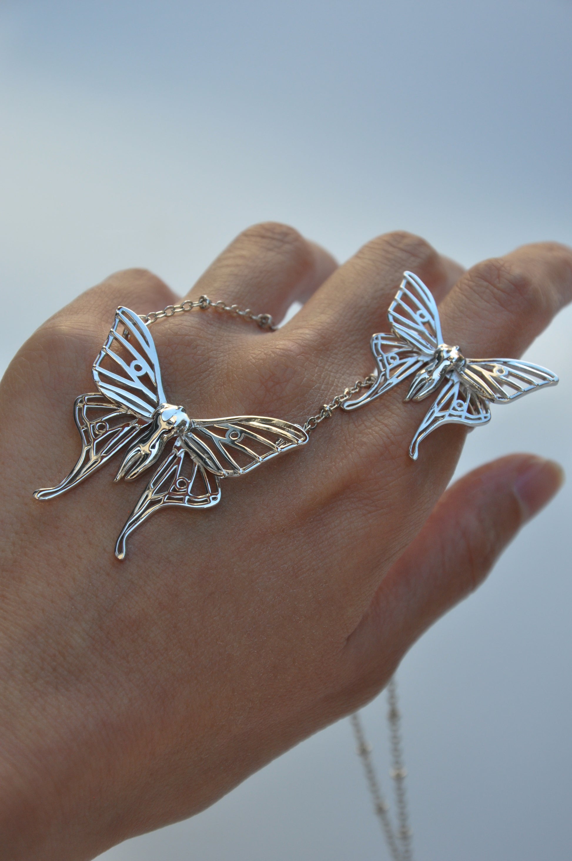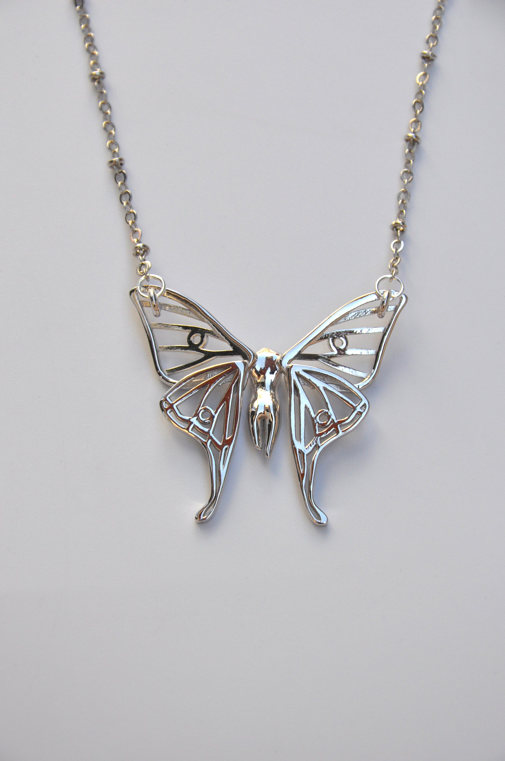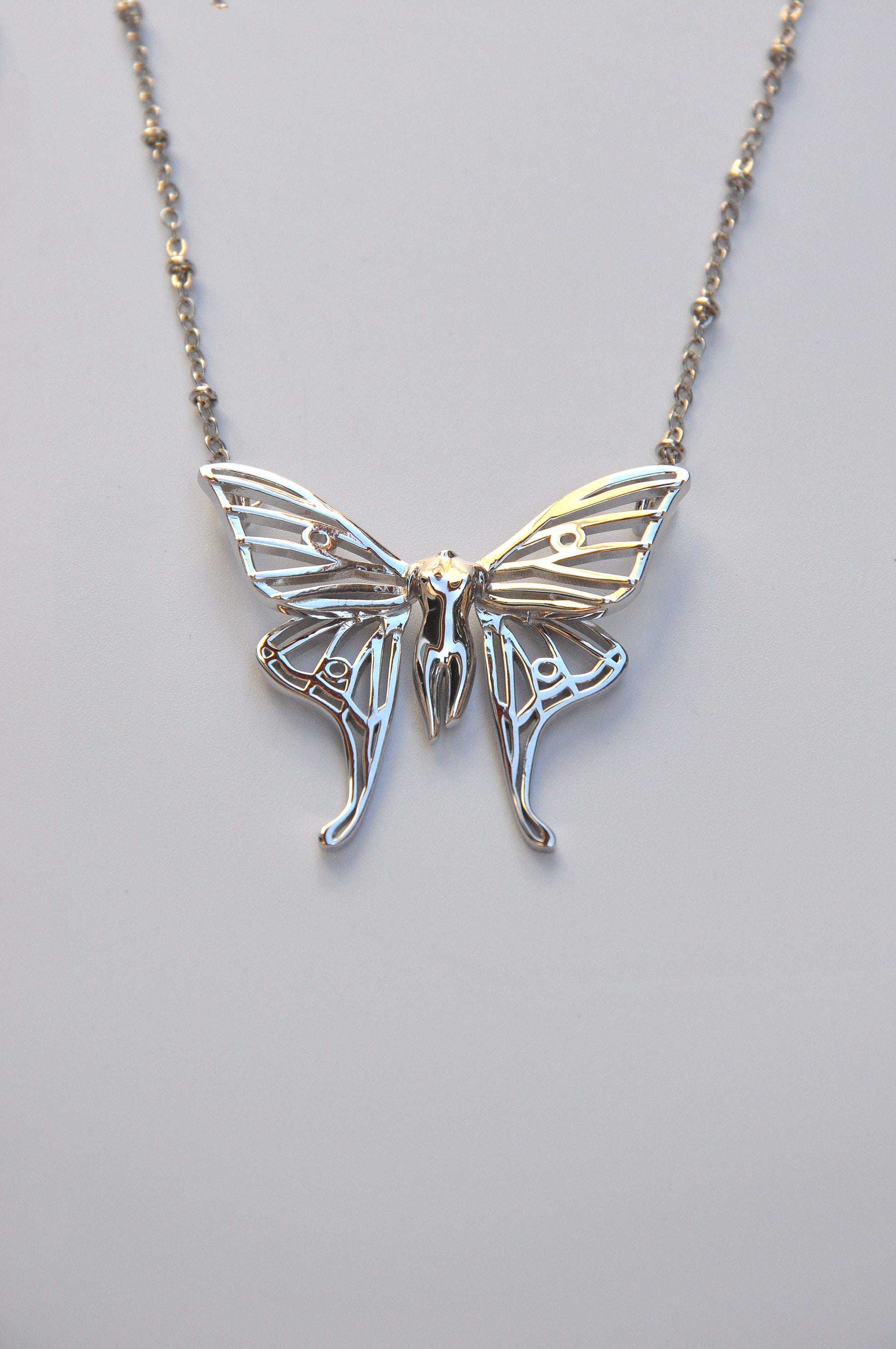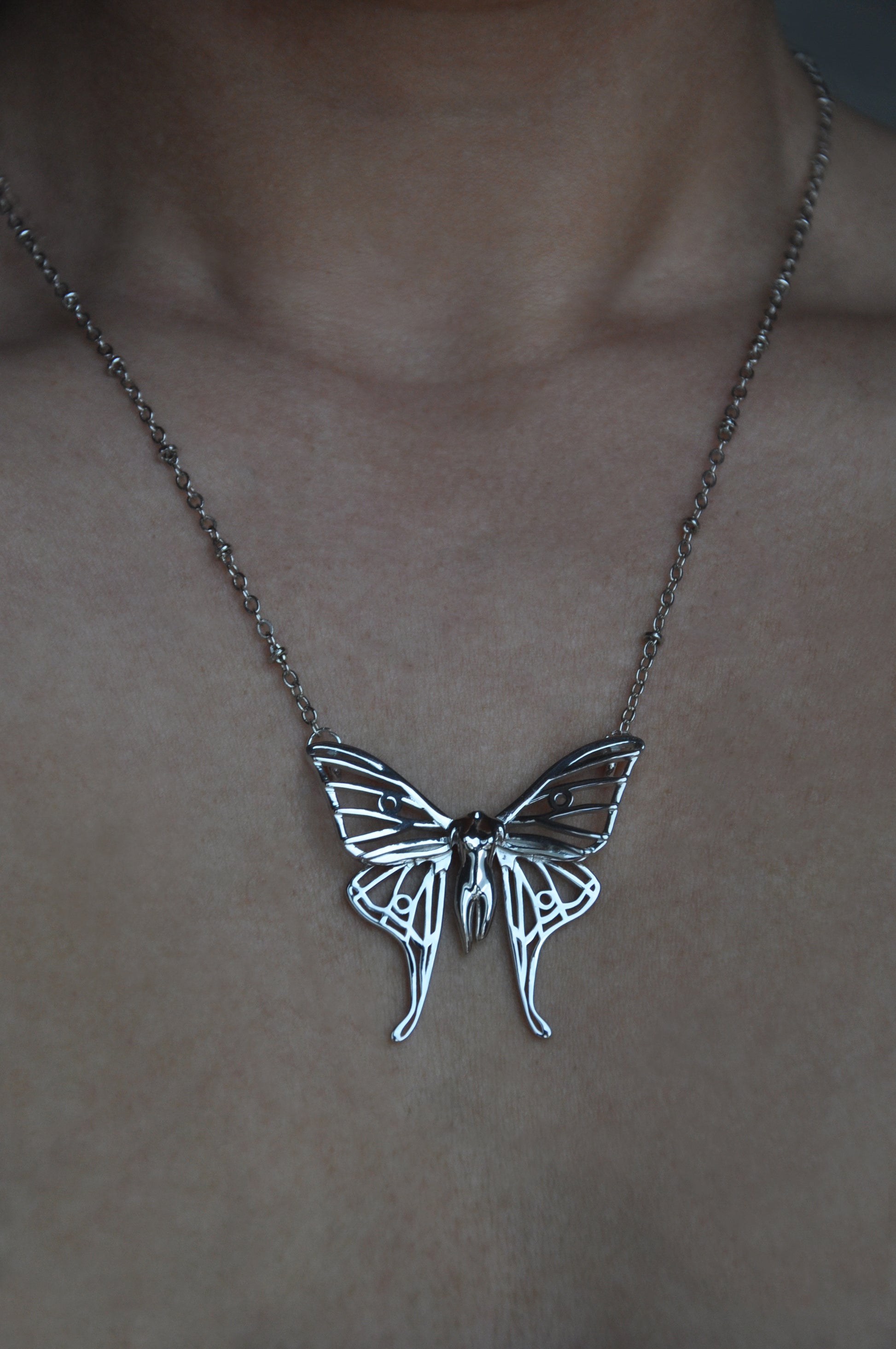 An emblem of transformation and mystery, this 925 sterling silver pendant intertwines the delicate wings of the Luna Moth with the torso of a female figure. With the head absent, the design evokes a sense of metamorphosis—capturing both the beauty and the uncertainty of change. Intricate details on the wings add depth to the symbolism, making this piece a quiet yet powerful statement.