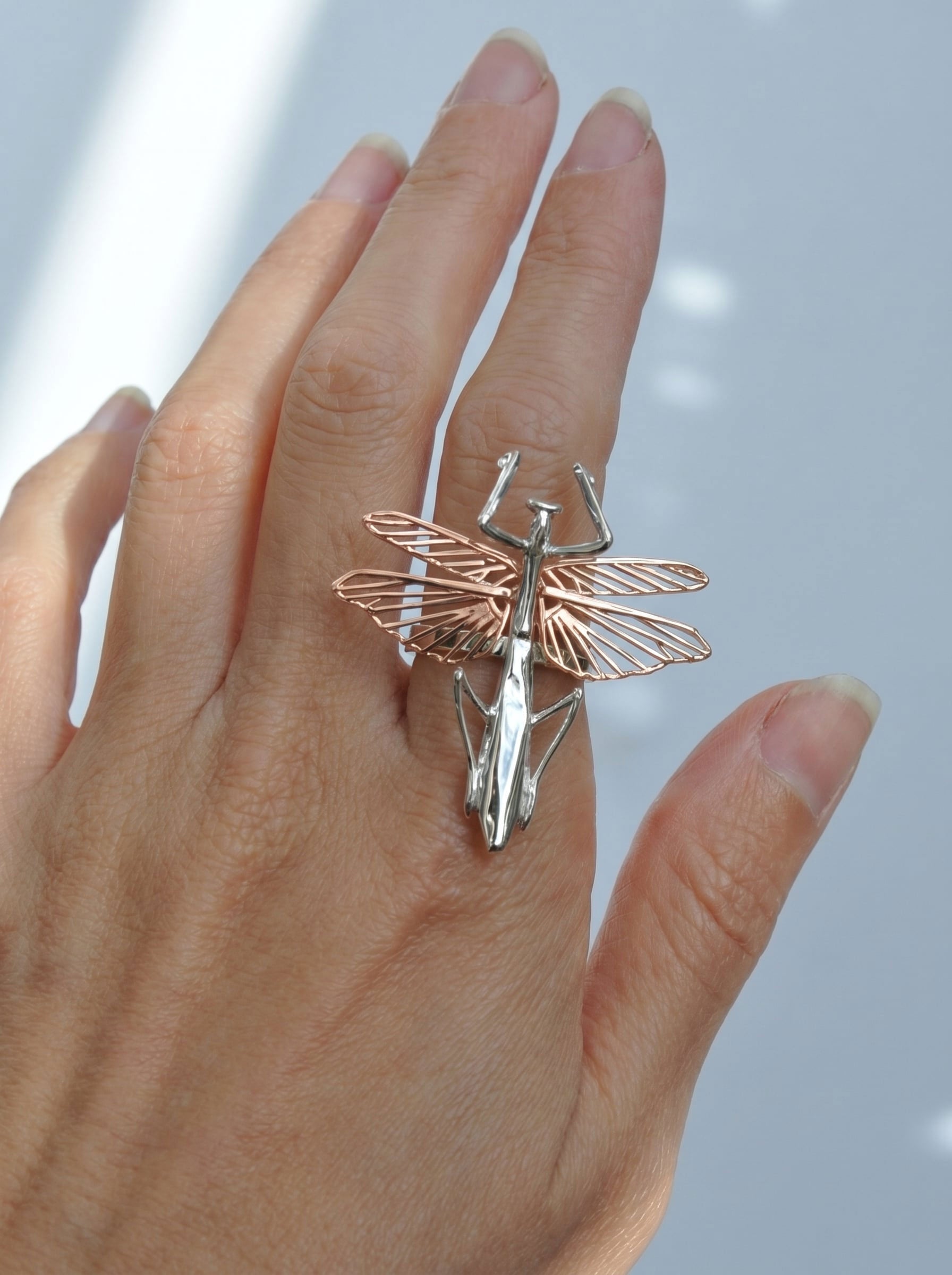 Each ring is shaped with meticulous attention to anatomical detail and polished by hand to highlight the mantis’s graceful lines and distinctive geometry. The result is a modular miniature sculpture that blends natural history, fine craftsmanship, and contemporary design.